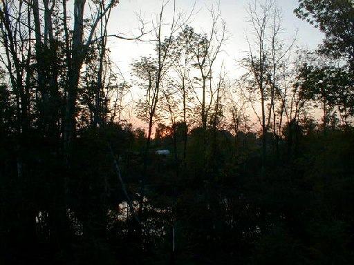↓ ベランダから見える森の日暮れ。この森から、時々リスが遊びに来るそうです。(MI)
