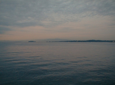 ↓ 桟橋より 左:海中鳥居,正面奥:箱根方面、右:江の島。