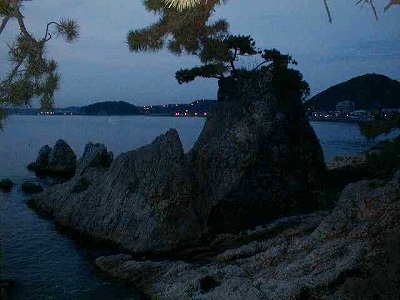 森戸神社前の海岸は岩がごつごつしています。