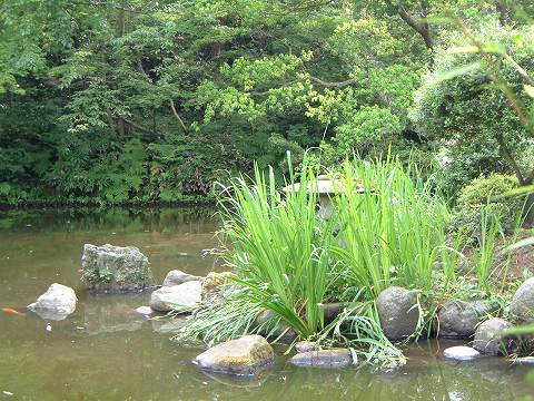 池上に架した茶室。六畳と四畳半の数奇屋造りで、明治9年十四代静月翁の造営。