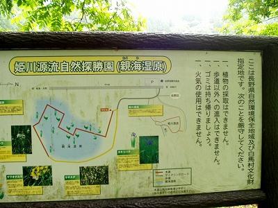 姫川源流自然探勝園(親海湿原) ここは長野県自然環境保全地域及び白馬村文化財指定地です。次のことを厳守してください。 1、植物の採取はできません。 1、歩道以外への進入はできません。 1、ゴミは持ち帰りましょう。 1、火気の使用はできません。 |