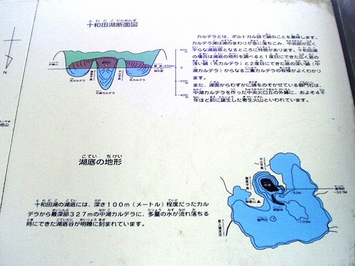 ◆十和田湖断面図◆ カルデラとは、ポルトガル語で鍋のことを意味します。カルデラ湖は湖の周りが急に落ち込み、中央部が広く平らな湖底原となるところに特徴があります。 十和田湖の場合は湖底の地形を調べると1度目にできた広く底の浅い鍋(先カルデラ)と2度目にできた底の深い鍋(中湖カルデラ)からなる二重カルデラの有様が良くわかります。 また、湖面からわずかに頭をのぞかせている御門石は、中カルデラを作った中央火口丘の外縁に、およそ4千年ほど前に誕生した寄生火山といわれています。 ◆湖底の地形◆ 十和田湖の湖底には、深さ100m程度だったカルデラから最深部327mの中湖カルデラに、多量に水が流れ落ちる時にできた湖底谷が、明瞭に刻まれています。 |