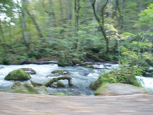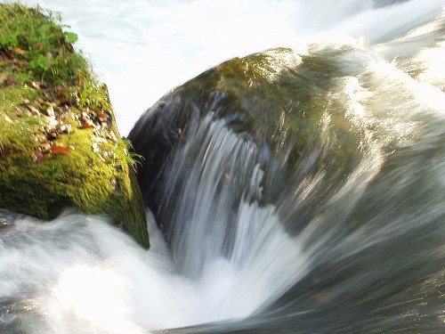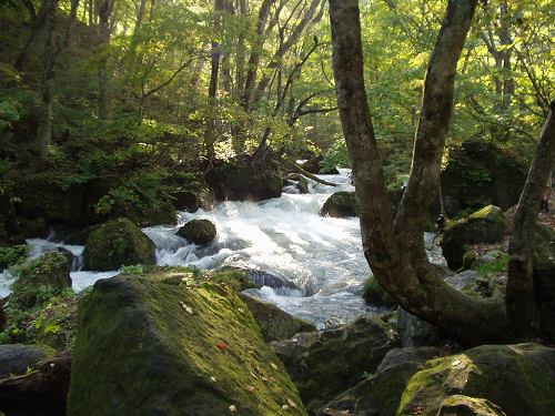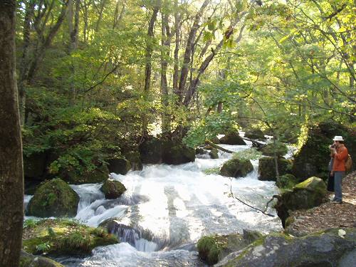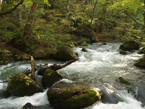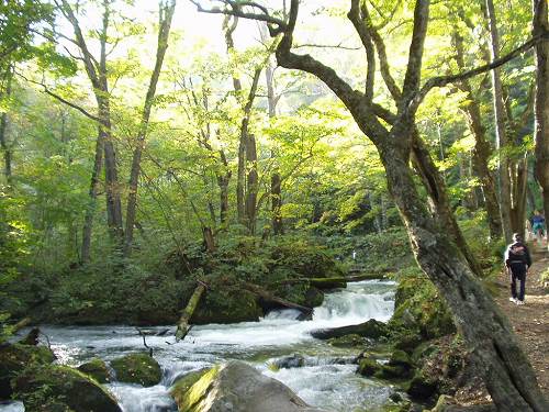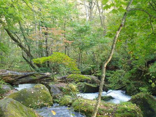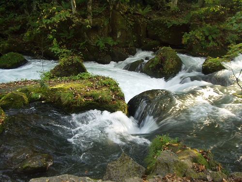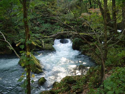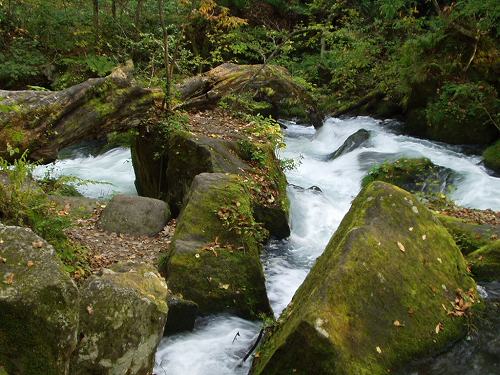 渓流のすぐ脇を、ハイキングコースの道と、十和田道という道路が走っています。