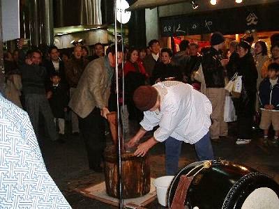 無料で配られるつきたてのお餅に長蛇の列。 |