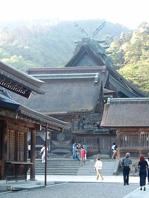 | 御本殿(ごほんでん)は、大国主大神さまがお鎮まりになり、大国主大神さまの御事蹟に対して建てられた宮です。高さ約24メ−トルの偉容は、御神徳(ごしんとく)にふさわしく比類のない大規模な木造建築の本殿です。「大社造り」と呼ばれる日本最古の神社建築様式の御本殿は、現在国宝に指定されています。御本殿をつつむようにそびえる八雲山(やくもやま)を背景にした姿は、たくましい生命力を感じ、見るものに感動を与えます。 |