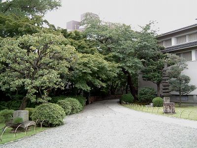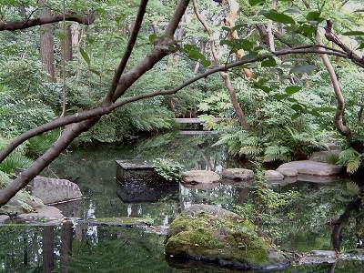 | 『千利休が茶庭の極意として示した 「樫の葉の紅葉ぬからに散りつもる 奥山寺の道の悲しき」 の言葉そのままの、 自然味の深い庭園です』 ・・・・ 樹が生い茂り 本当に 自然味の深い庭園 だと思いました。 |