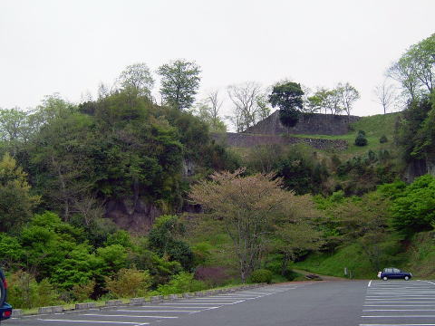 中央右の高い場所にあるのが岡城址、↑今は土台だけです。 |