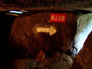 青い線が地上の遊歩道 中央の一部赤い線が 180mの岩屋くぐりの場所です。 この絵のように、 真っ直ぐではありません。 水色、オレンジ、黄色は別のコースです。 |
