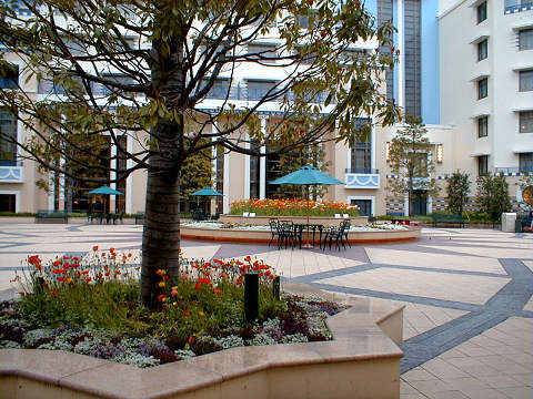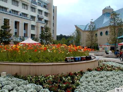 ↓ ホテルとイクスピアリの間にある中庭。ポピー畑のまわりを、おもちゃの汽車が走っていました。