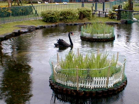 黒鳥が優雅に水面を進みます。ひとなつこく餌を欲しがりますが、 「もう、お腹がいっぱいです。餌を与えないで下さい。」と貼り紙がありました。 |