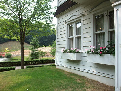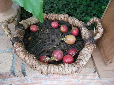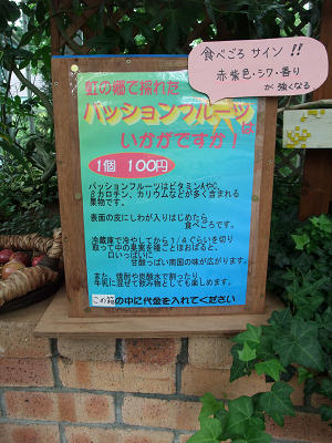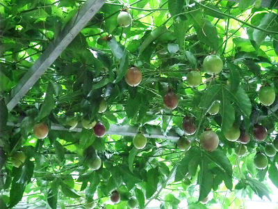 窓が開け放たれたプリンセスローズハウス(温室)の中で パッションフルーツが実を結んでいました。