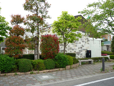 | 文化交流館の建物 人工的に作られた大谷石風の 素材を使った壁面 |
