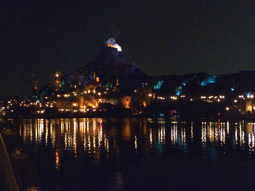 | プロメテウス火山 今日入場して、 初めに目に入った メディテレーニアンハーバーの 対岸に見える火山 火口から赤い炎が見えます。 水面の明かりの写りこみが素敵です。 ディズニーシーを ひとまわりしました。 |