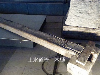 | 都市江戸には自然流水を利用した上水道が敷設され、汐留地域には多摩川上水が引き込まれていた。上水は地中に木製の水道管(木樋もくひ)をつなぎ、上水井戸から水を汲み上げて利用した。明治に入っても玉川上水は利用され続けたが、木樋は腐蝕しやすいため、ベルギー製鉄管が上水井戸に接続された。こうした上水は20世紀に入るまで、改良されつつ利用されていた。 |