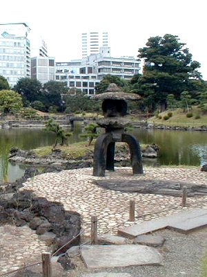 沿革:周辺をビルに囲まれながらも、今に残る大名庭園としては、最も古いものの一つで、江戸庭園の典型である回遊式 築山泉水庭園。昔は東京湾の波うちぎわでしたが、江戸時代の明暦の頃埋めたてられ延宝6年(1678)時の老中 大久保忠朝が四代将軍家綱から下屋敷として賜り、約8年くらいかけて作庭し「楽寿園」と命名しました。 庭園はその後数氏を経て有栖川宮家のものとなり、明治8年(1875)宮内庁が買い上げて翌9年芝離宮となりました。 大正13年(1924)昭和天皇のご成婚記念として、東京市に下賜され「旧芝離宮恩賜庭園」として公開されました。 冊子より 大きな石灯籠