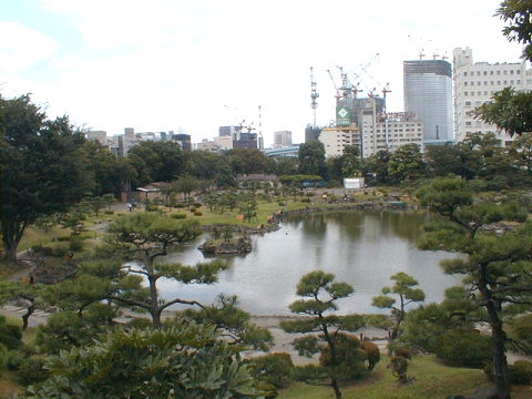 ↓ 旧芝離宮恩賜庭園の中で一番高い大山の眺めです。工事中のビルがたくさんあります。