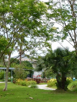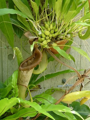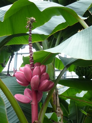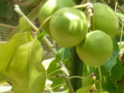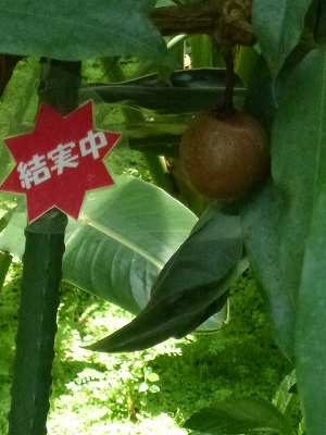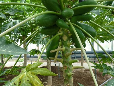 パパイヤは、熱帯及び亜熱帯アメリカの原産で、現在では世界中の熱帯・亜熱帯地域で栽培され、土壌はやや粘質で、排水が良く、有機質に富むことが必要です。樹はやわらかい木質の小高木で、果樹全体に乳液を含んでいます。熱帯果樹の中で、パパイヤほど早く実る果物はなく、種子をまいて半年で結実し始めます。パパイヤは種子繁殖ですが、花は一般的に、雄花、雌花、両性花です。この室内で栽培しているパパイヤは雌株で食味のよい品種です。果肉が黄色で、多量のカロチンを含む果物で、大変な健康食です。果実は生食用として最も広く用いられ、他にジュース・砂糖漬け、などにも利用されています。