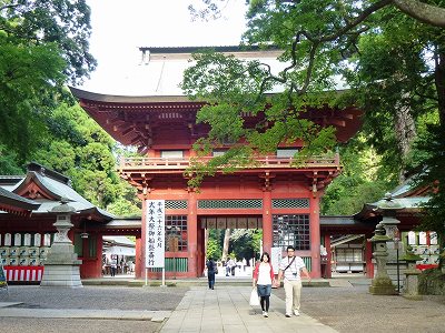 | 寛永11(1634)年、徳川頼房公が奉納したこの門は「日本三大楼門」の一つ。緑の中にひときわ朱色が鮮やかです。なお、「鹿島神宮」の扁額は東郷平八郎元帥の直筆によるものです。 |