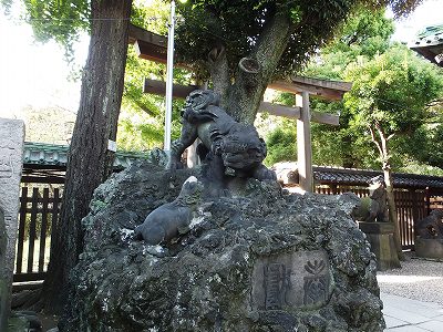 本殿前には狛犬の代わりに狛牛があります。