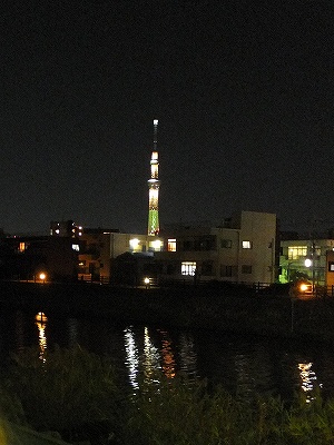 帰り道 クリスマスバージョンのスカイツリーが見えました。
