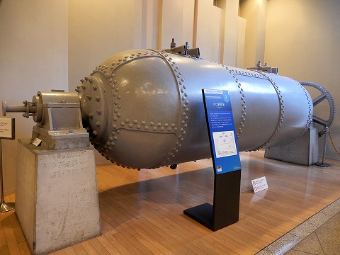 博物館入口に展示された「ボロ蒸煮釜」 産業遺産コレクションⅠ