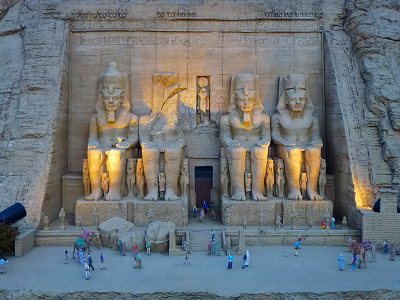 | ラムセス2世によって造られたもので岩を掘り込んだ典型的な岩窟神殿(がんくつしんでん)です。前面にある高さ約20mの4つの座像は、ラムセス2世の像といわれています。 |