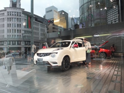 服部時計店などが裏返しに映っています。