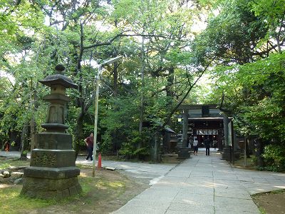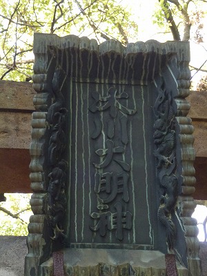 石段に上る所に、左右2基の石灯籠があります、享保9年閏4月氏子が奉納したものです。石段を33段上ると、そこにも石畳と狛犬が左右にいます。45歩あるくと、花崗石の鳥居がそびえ、氷川大明神の5字が読み取れます。尚、鍵の手形の石畳を右に進み、鳥居をくぐり左に水屋を見て中門を入ると社前に達します。
