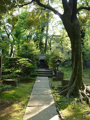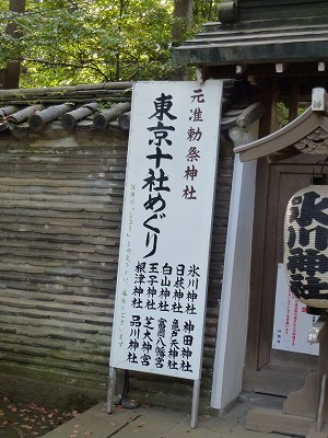 「氷川神社は、氷川町52番地に鎮座する府社で、赤坂区第1の鎮守社です。同町中央窪地より西に向い、石畳をを踏み進めば、高燥の丘があり、是れが即ち神苑です。ふもとに花崗石のたまがきがあり、右に四合稲荷の小さいほこらがあります。