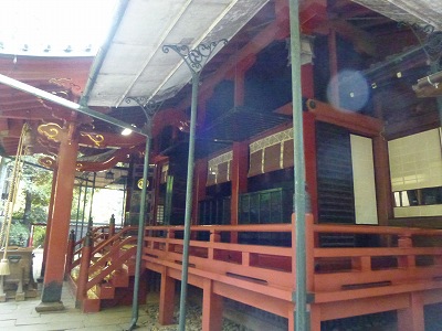 拝殿は、銅瓦葺、障泥博風、桝組、向拝付勾欄造、惣朱塗上蔀です。本殿、幣殿其の後にある青すだれを半分巻き、神鏡は長い時間輝き、神霊灼にかしこみ、お参りする人は思わず頭を垂れました。」 |