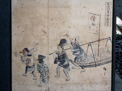 香取神社の道祖神祭は、毎年正月14日、氏子の子供たちが宝船をかつぎ、亀戸から両国のあたりまで練り歩いたもので、享保の頃からはじまり、明治初期まで続きました。その光景は『江戸名所図会』の挿絵に載せられ、『東都歳時記』にも記載されています。本図は人物や宝船を墨で描き、朱、青で淡彩を施しています。作者は浮世絵師・歌川広重(1797〜1858)で嘉永5年(1852)以降、広重の円熟期に描かれた作品とみられます。