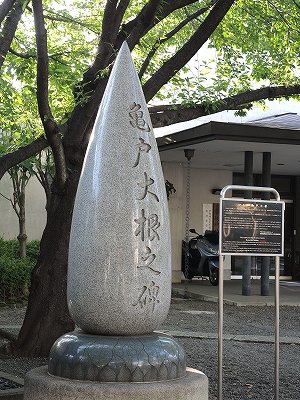 明治のころは「おかめ大根」とか「お多福大根」といわれましたが、大正初期になって産地の名をつけて「亀戸大根」と呼ばれるようになりました。しかし、宅地化が進んだ大正時代の終わり頃から、産地は江戸川区小岩や葛飾区高砂などに移って行きました。