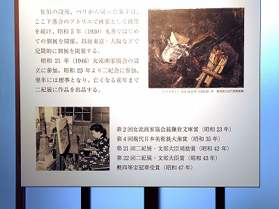 昭和21年(19146)女流画家協会の設立に参加。昭和23年より二紀会に参加、翌年には理事となり、亡くなる前年まで二紀展に作品を出品する。