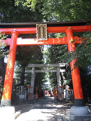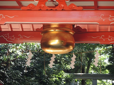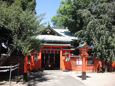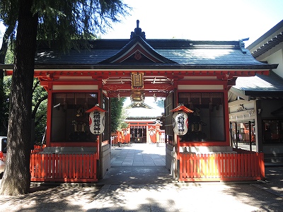 現在の拝殿は昭和13年の改築ですが、本殿前の朱塗りの随神門は、昭和50年鎮座700年記念事業の建立で、左右に随神像を祀り、中央天井に都内最大と言われる開運の大鈴(直径75cm)がつるされています。お神輿は大正11年の東京博覧会に出品されたもので高さ2.5m台幅1m重さ1.5tの白木造りの大神輿で区内でも1・2の大きさと言われています。