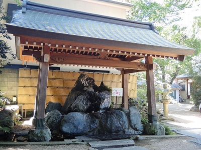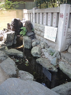 関東大震災以降、急速に宅地化し、農地が失われ、不要となった河川はコンクリートの擁壁に囲まれ、本来の流域を失いました。馬橋の命の川、桃園川に思いを馳せ、参道に小さなせせらぎを作りました。