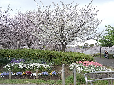 花壇の中の八重桜も
