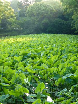 ハスの和名は、万葉時代に花托(かたく)の形がアシナガバチの巣に似ていることから「蜂巣(ハチス)」と名付けられ、後に「チ」が省略されて「ハス」となりました。南堀に群生するハスは、1979年(昭和54)に大賀ハスを株分けして繁殖させたものです。