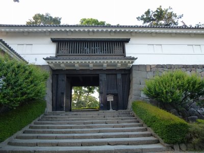 | 屋曲輪から二の丸に通じる位置にあり、二の丸の正門にあたります。渡櫓門、内仕切門と土塀で周囲を囲む枡形門の構造を持ちます。渡櫓門にはその名の由来となった銅板の装飾が映えます(平成9年復元)。 |