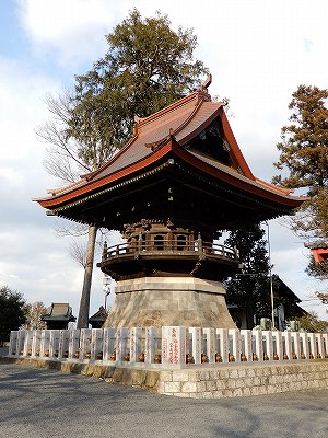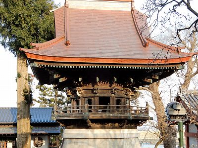 鐘楼は棟札によると文化15年(1818)の建立です。八角形(一辺11.4尺・3.4m)の石積基壇(基礎)の上に、十二角形に柱を立て、周囲に円形の縁を巡らし、その中央に鐘を吊り下げています。屋根は銅板葺の入母屋造りで、軒下には十二支などの彫刻が配置されています。