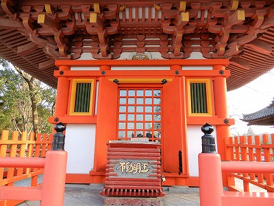 下から八角形の基壇、円形の縁、十二角形に配置された柱という組み合わせとなっており、非常に独創的な形の建造物となっています。装飾に多くの彫刻が使われている点とあわせて、、近世の寺社建築の多様なあり方を示しています。