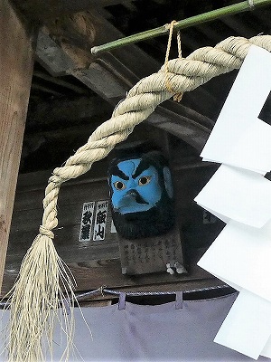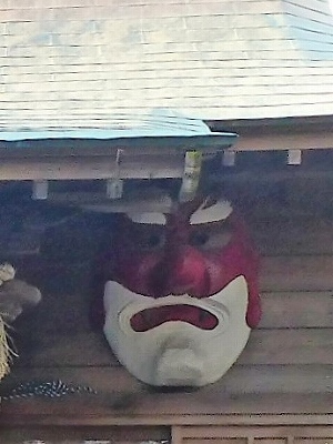 軒下左に青、右に赤い天狗のお面がありました。