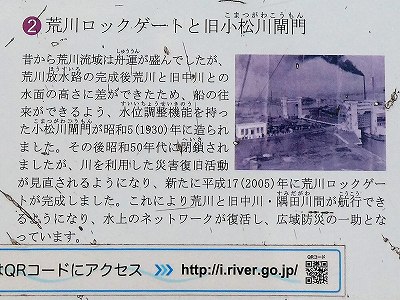 | 昔から荒川流域は舟運が盛んでしたが、荒川放水路の完成後荒川と旧中川との水面の高さに差ができたため、船の往来ができるよう、水位調整機能を持った小松川閘門が昭和5年(1930)に造られました。その後昭和50年代に閉鎖されましたが、川を利用した災害復旧活動が見直されるようになり、新たに平成17年(2005)に荒川ロックゲートが完成しました。これにより荒川と旧中川・隅田川間が航行できるようになり、水上のネットワークが復活し、広域防災の一助となっています。 |