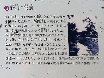 | 江戸初期に江戸の町へ物資を輸送する水路を確保するために、隅田川と中川を結ぶ小名木川の延長線上に、中川と江戸川を結ぶ新川が江戸幕府によって開削されました。当初は行徳の塩を運ぶ目的でつくられましたが、その後、利根川、江戸川、新川、小名木川を通って様々な物資が輸送されることとなり、大いに賑わいました。新川開削で発生した土砂は周辺の湿地の埋め立てに使われ新田開発が行われました。小名木川・新川開削から江戸末期まで続けられた埋め立てにより、陸地が増え海岸線は3kmほど南に移動しました。 |