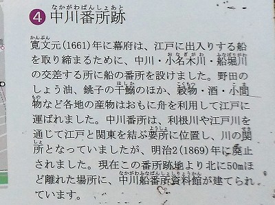| 寛文元年(1661)に幕府は、江戸に出入りする船を取り締まるために、中川・小名木川・船堀川の交差する所に船の番所を設けました。野田の醤油、銚子の干鰯のほか、穀物・酒・小間物など各地の産物はおもに舟を利用して江戸に運ばれました。中川番所は、利根川や江戸川を通じて江戸と関東を結ぶ要所に位置し、川の関所となっていましたが、明治2年(1869)に廃止されました。現在この番所跡地より北に50mほど離れた場所に、中川船番所資料館が建てられています。 |