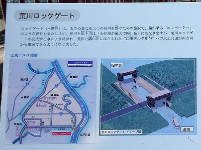 | ロックゲート (= 閘門)は、水位の異なる二つの河川をつなぐための施設で、船が乗る「エレベーター」のような役割を果たします。荒川と旧中川は「水位差が最大で約3.1m」にもなりますが、荒川ロックゲートが完成することにより結ばれ、荒川と隅田川に挟まれた“江東デルタ地帯”への水上交通が両方向から確保できるようになりました。 |