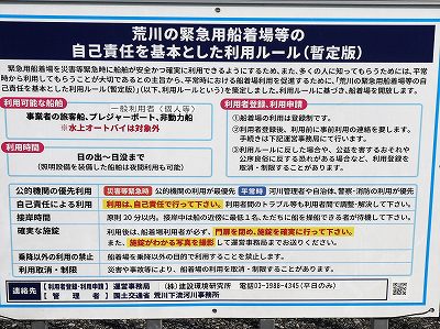 | リバーステーションは、災害時の復旧活動に必要な資機材や、救援物資等の積み降ろしなどを行う大切な拠点として、また、平常時においては、荒川の舟運の復活を目指して整備されているものです。ここ小松川リバーステーションもその一つです。現在小松川リバーステーションでは、河川工事関係の資材の搬入・搬出や土砂の陸揚げ、防災訓練のほか、「荒川レガッタ」などのイベントにも利用されています。 |