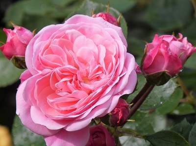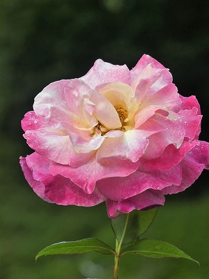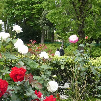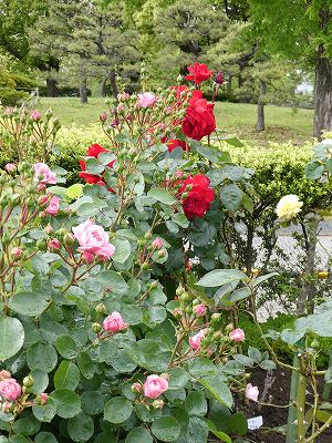 白色、赤色、ピンクと白ツートーンカラーのバラ