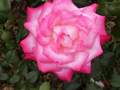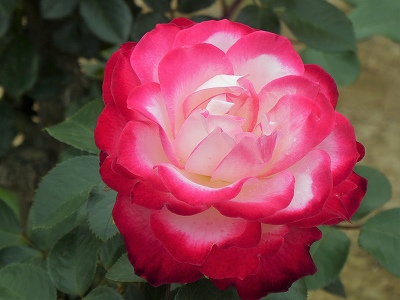 聖火は、白地に濃いローズ色の覆輪が、開花するにつれ全体に燃えるように赤みが増します。