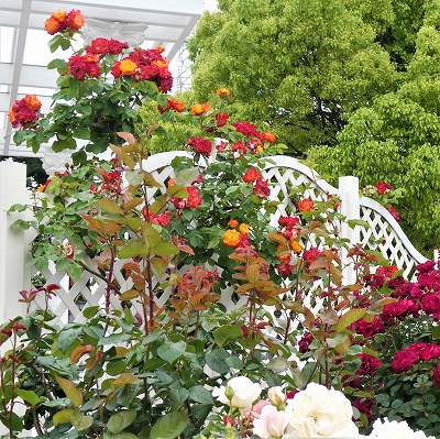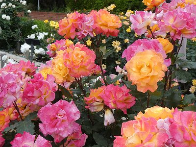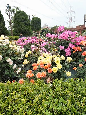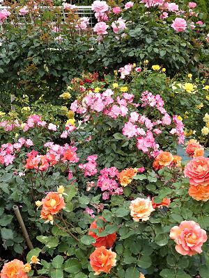 たくさんの色と種類のバラが満開で、