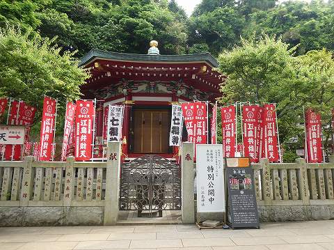 | 江の島弁才天は、安芸の宮島、近江の竹生島と並び、日本三大弁才天の一つに数えられるほか、七福神の紅一点としても人々の信仰を集めています。鎌倉時代には戦勝祈願(八臂像)、江戸時代から芸能・音曲上達祈願、(二臂像)と信仰目的が変わってきました。奉安殿は平成27年(2015)に改修されました。 |